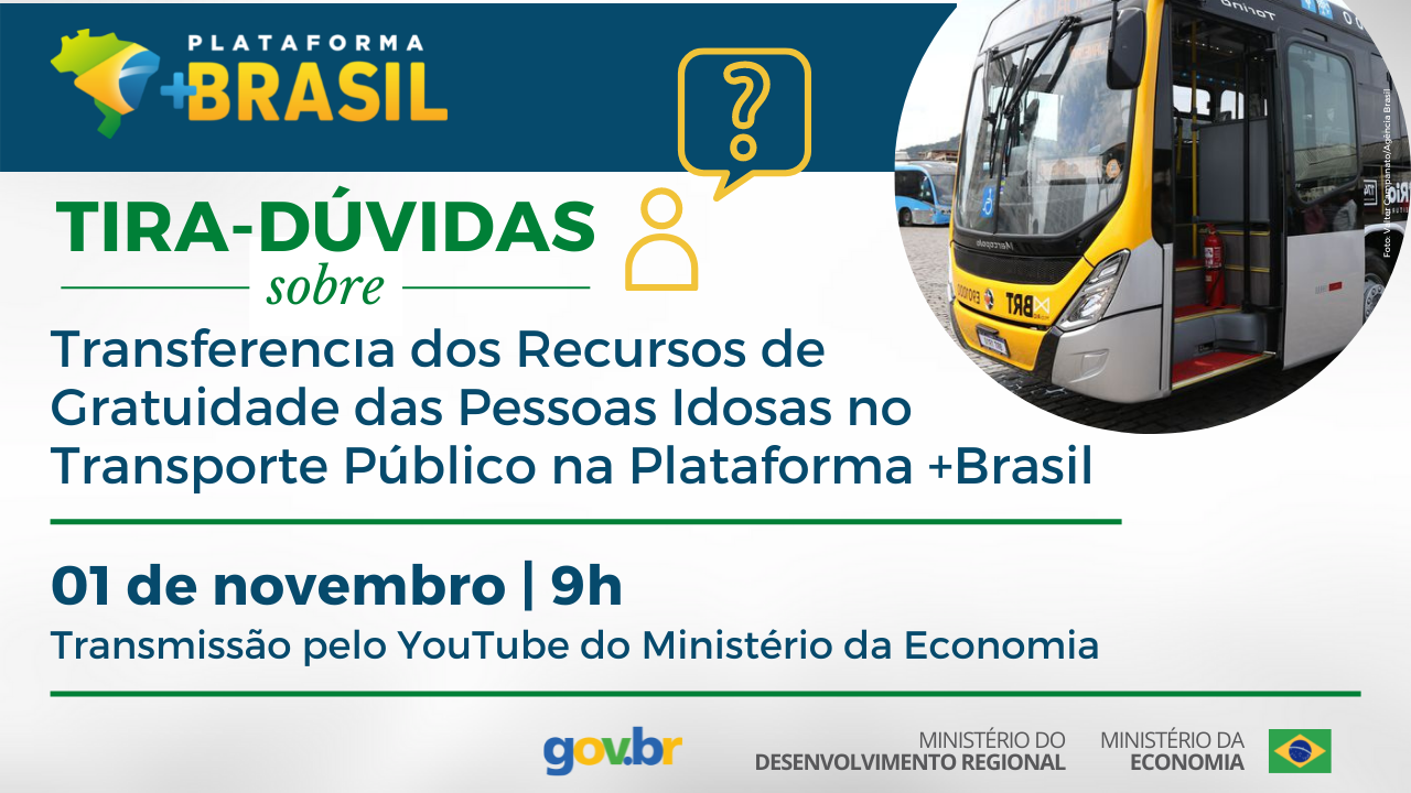 Live de Tira-Dúvidas sobre a Transferência dos Recursos de Gratuidade das Pessoas Idosas no Transporte Público na Plataforma +Brasil.Evento virtual com o objetivo para tirar dúvidas sobre a transferência dos recursos da assistência financeira para auxílio ao custeio da gratuidade das pessoas idosas no transporte público coletivo urbano, instituído pela Emenda Constitucional n. 123, de 14 de julho de 2022 na Plataforma +Brasil.