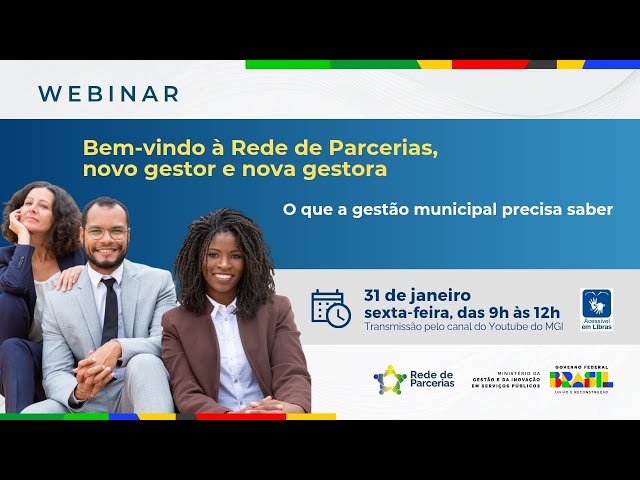 Objetivo: O webinar "Bem-vindo à Rede, gestor e gestora municipal" tem como objetivo apresentar e discutir as principais pautas e ferramentas de apoio aos novos gestores municipais, com ênfase em temas essenciais para o desenvolvimento local, como parcerias, captação de recursos, inovação tecnológica e políticas públicas voltadas à gestão municipal.