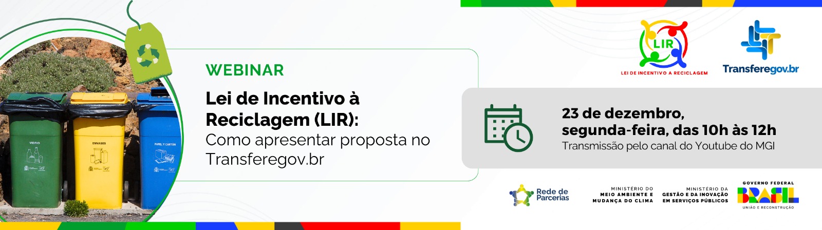 Horário: 10h às 12h (horário de Brasília-DF)Objetivo: Capacitar e orientar sobre o envio de propostas para os programas da Lei de Incentivo à Reciclaem na plataforma Transferegov.br.