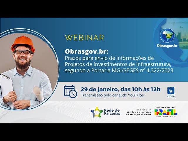 Com a proximidade dos prazos para envio das informações de Projetos de Investimentos em Infraestrutura., o evento busca capacitar e informar Coordenadores Federais, Estaduais e Municipais da Rede de Parcerias e demais gestores interessados no assunto, sobre o Obrasgov.br. A solução foi criada para consolidar, sistematizar, centralizar e tornar gerenciável o controle sobre o universo de obras públicas financiadas pela União, em suas diversas ações e políticas, em todo território nacional. A plataforma reúne informações acerca da geolocalização dos investimentos e permite se integrar aos demais sistemas de acompanhamento, controle e fiscalização, otimizando, assim, o acesso dos cidadãos a informações e fortalecendo a transparência no que se refere ao uso racional dos recursos públicos.