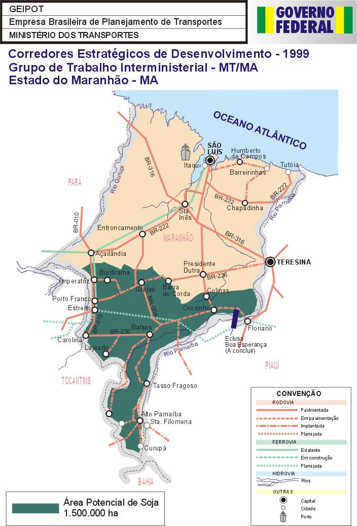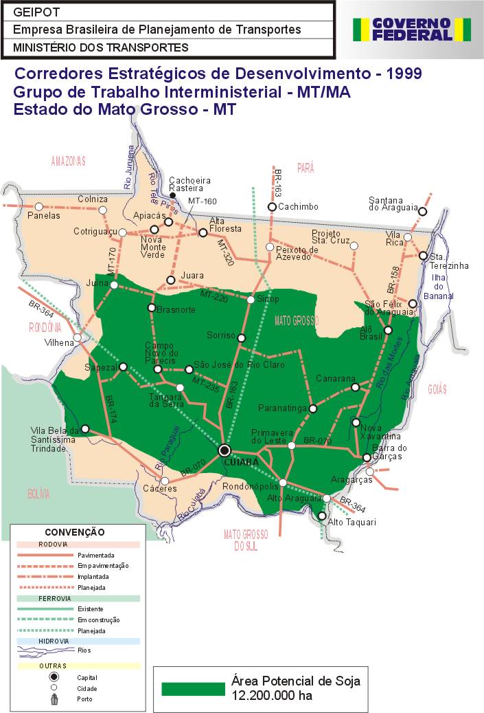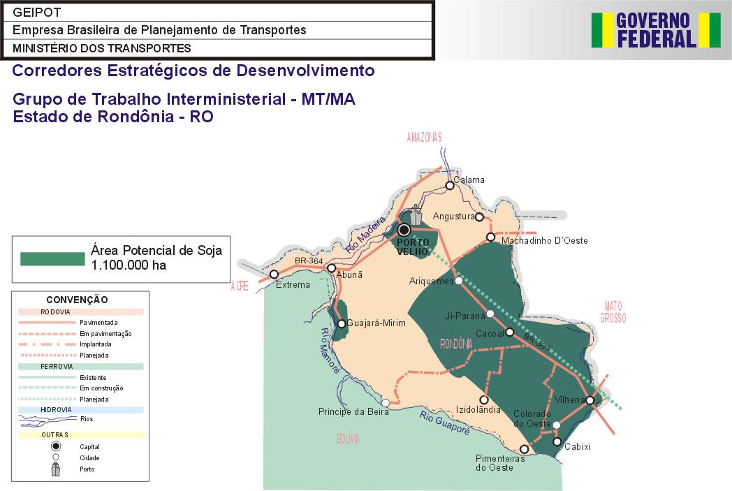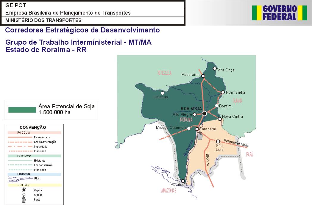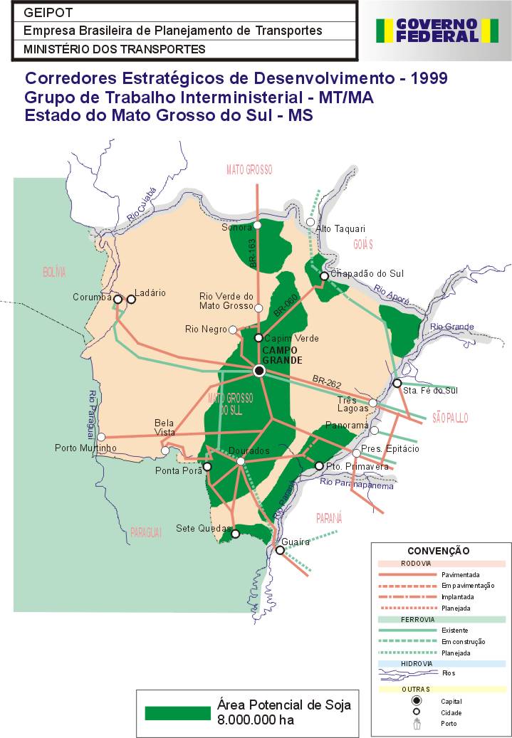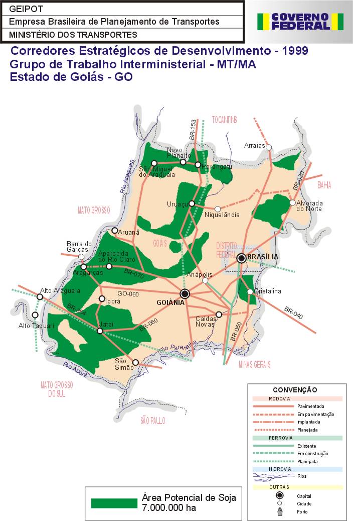 Como primeiro resultado das ações do Grupo, é apresentado neste Relatório a identificação das áreas potenciais para a produção dos granéis agrícolas nos estados de Mato Grosso, Mato Grosso do Sul, Bahia, Tocantins, Maranhão, Piauí, Rondônia, Goiás, Roraima e Pará, assim como a identificação das necessidades do sistema viário, inclusive de rodovias vicinais e uma estimativa de investimentos.