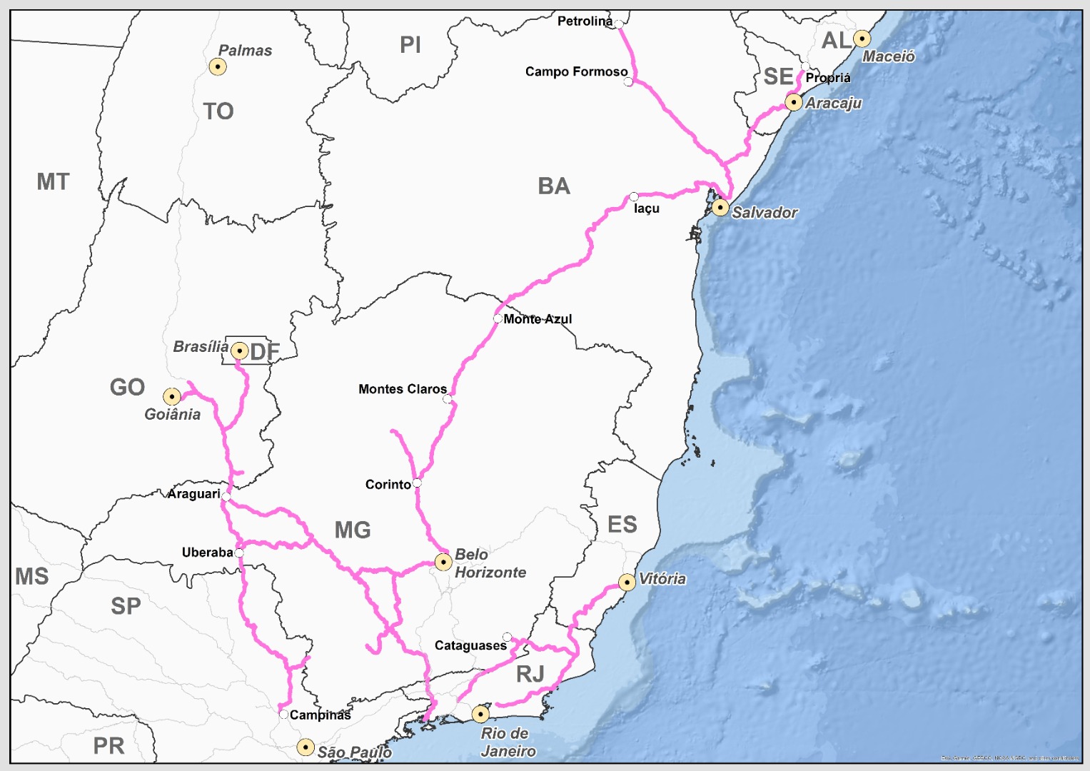 Estados: SE, BA, MG, ES, RJ, SP, GO e DF