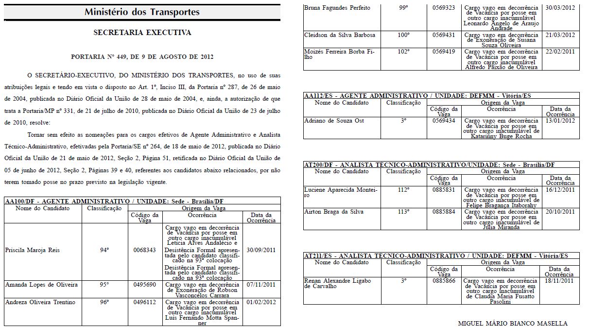 Torna sem efeito nomeações para os cargos de Agente Admnistrativo e Analista Técnico Administrativo.