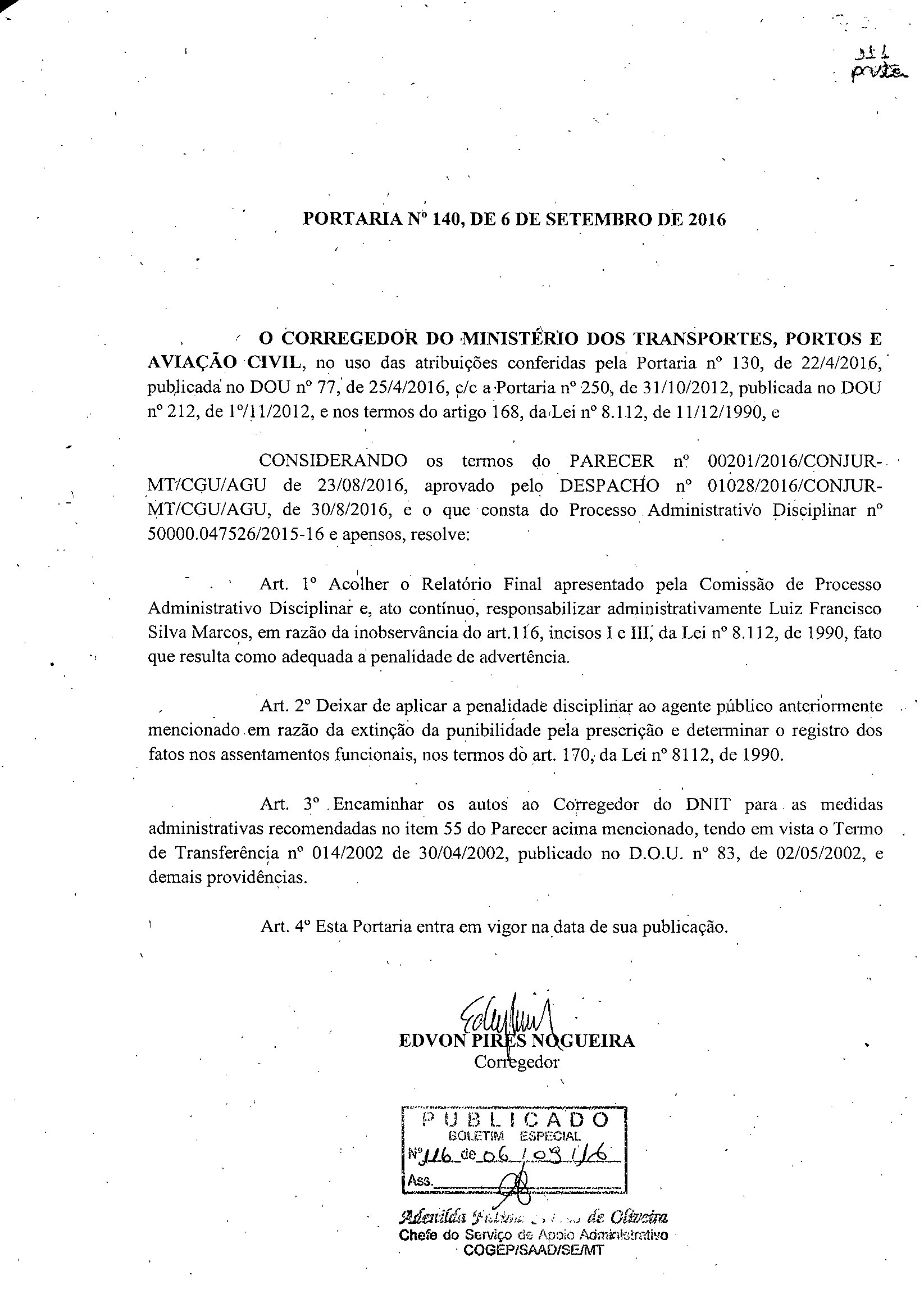 | 38 | 00045.003107/2013-16 | Portaria nº 166 | BE nº 137 25/10/16 | |