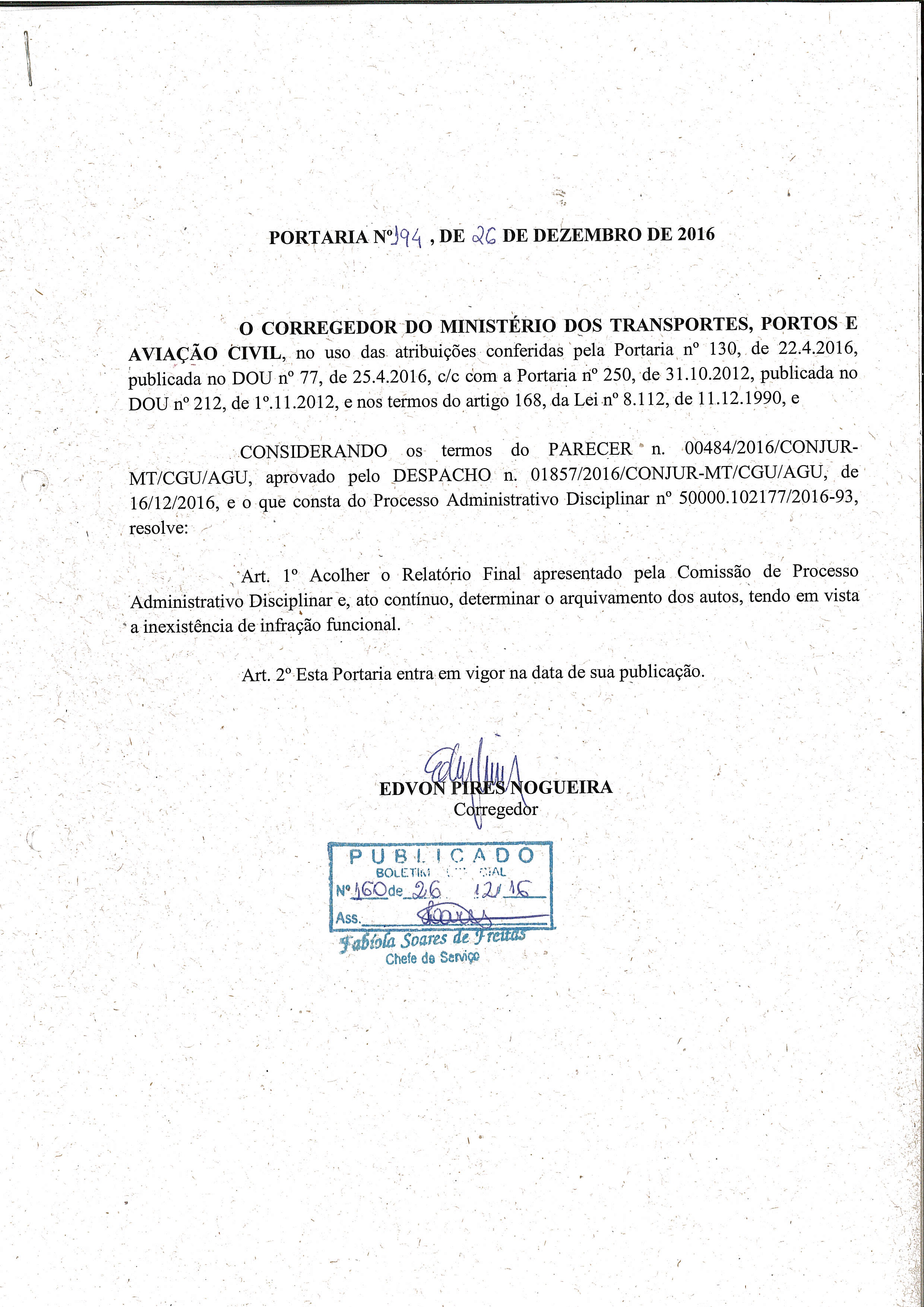 | 41 | 50000.024971/2015-16 | 50000.102177/2016-93 | Portaria nº 194 | BE nº 160 26/12/16 |