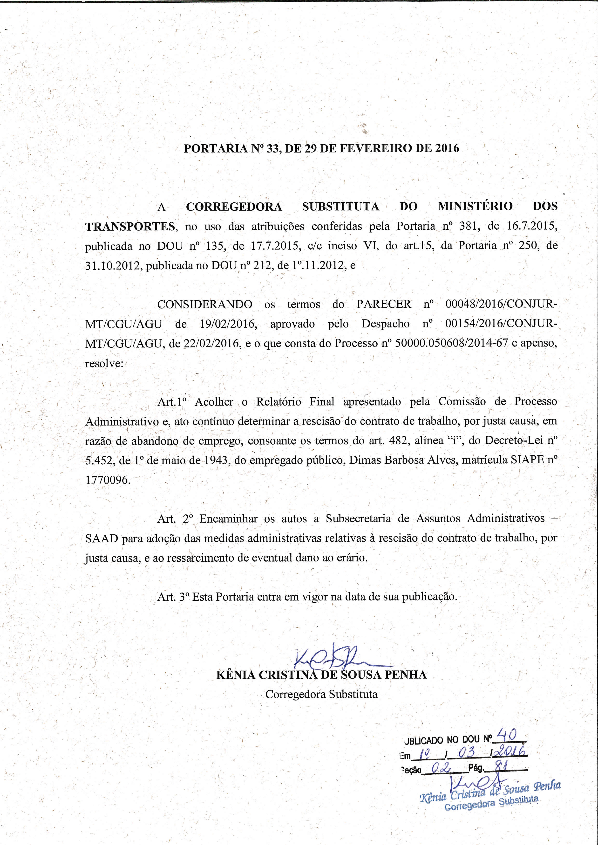 | 23 | 50000.031803/2012-26 | 50000.050608/2014-67 | Portaria nº 33 | DOU nº 40 01/03/16 |