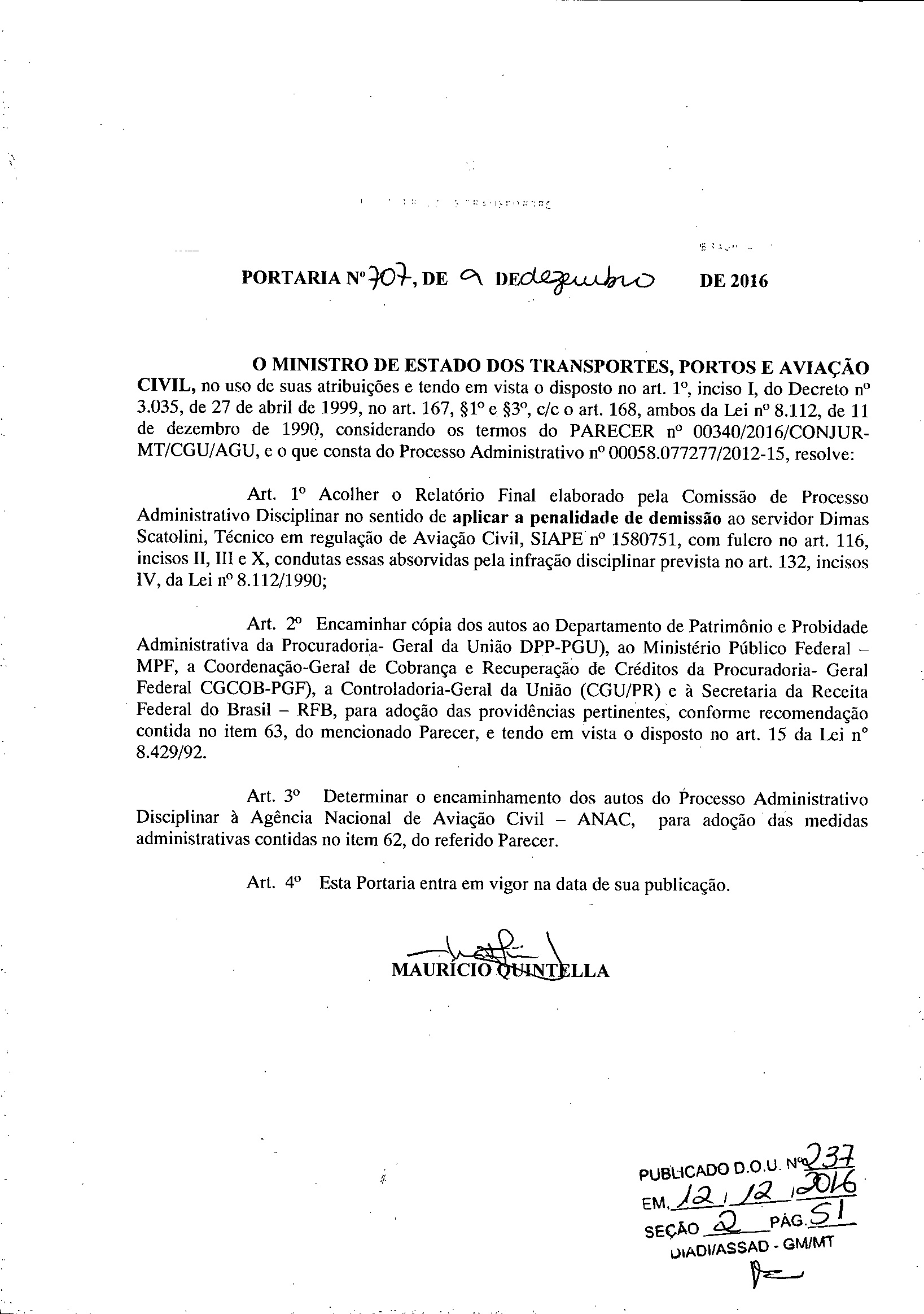| 19 | 00058.077277/2012-15 | 00058.077277/2012-15 | Portaria nº 707 | DOU nº 237 12/12/16 |