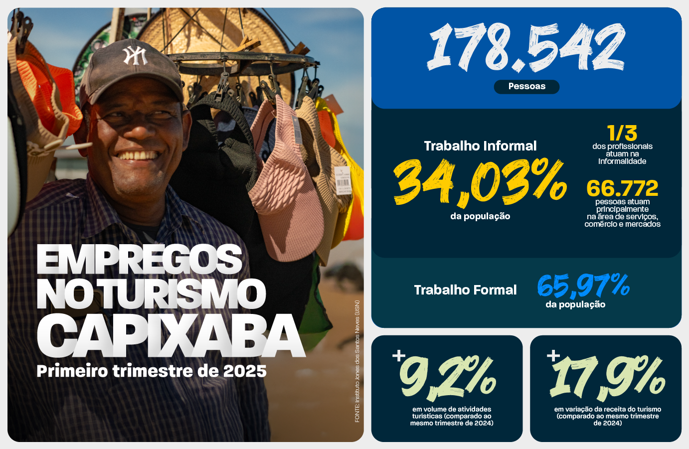 E o turismo é forte no estado: representa entre 7% e 8% do Produto Interno Bruto (PIB) capixaba. Os negócios voltados à alimentação são o principal motor do setor, concentrando a maior parte dos empregos no segmento — de ambulantes a restaurantes e pousadas.