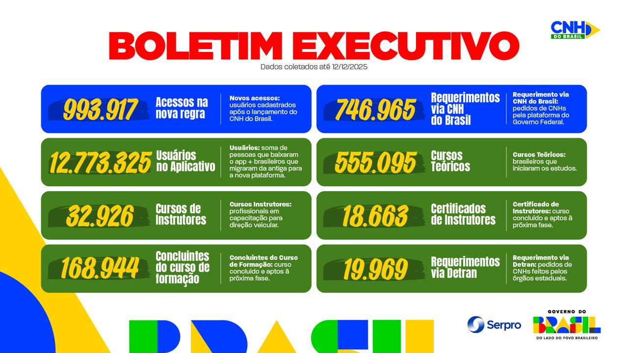 O novo aplicativo CNH do Brasil já mostra impacto concreto na transformação digital do processo de habilitação. Desde o lançamento da ferramenta, na terça-feira (9), 12.773.325 pessoas já aderiram à novidade do Ministério dos Transportes. Isso significa que 1 em cada 20 brasileiros acessou o novo sistema, disponível em todas as unidades da Federação. Além disso, foram registrados 746.965 pedidos de abertura de habilitação. Os dados são da Secretaria Nacional de Trânsito (Senatran).