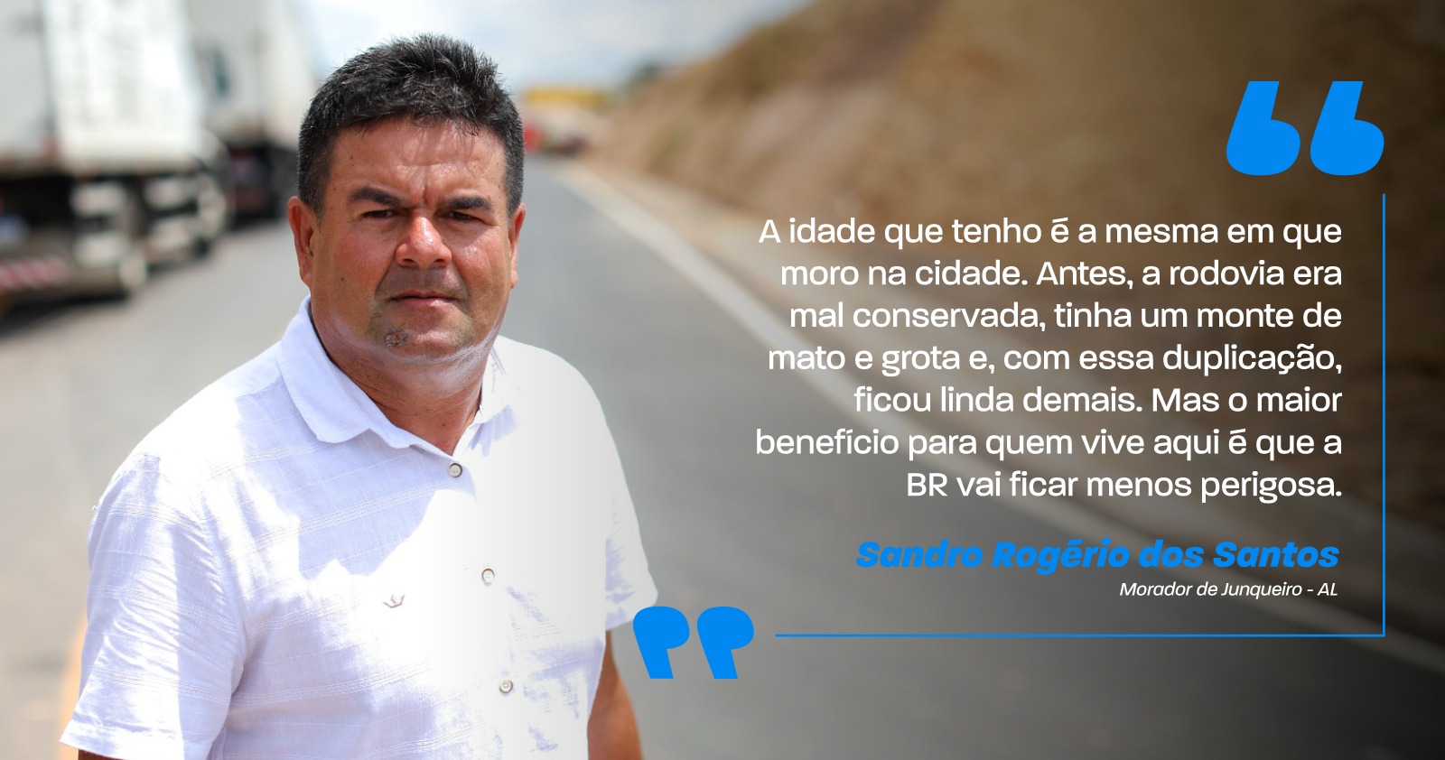 Para quem vive próximo à BR-101/AL, a mudança é sentida no dia a dia. Morador de Junqueiro há 53 anos, Sandro Rogério dos Santos acompanhou a entrega da duplicação e destaca o impacto da obra na segurança.