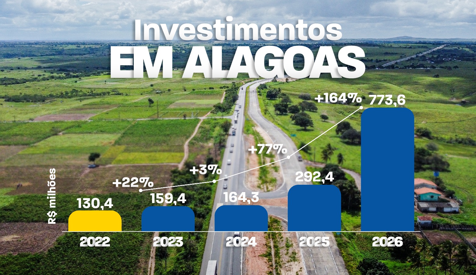 Os investimentos do Ministério dos Transportes em Alagoas cresceram nos últimos anos. Os aportes passaram de R$ 130,4 milhões em 2022 para R$ 773,6 milhões em 2026.