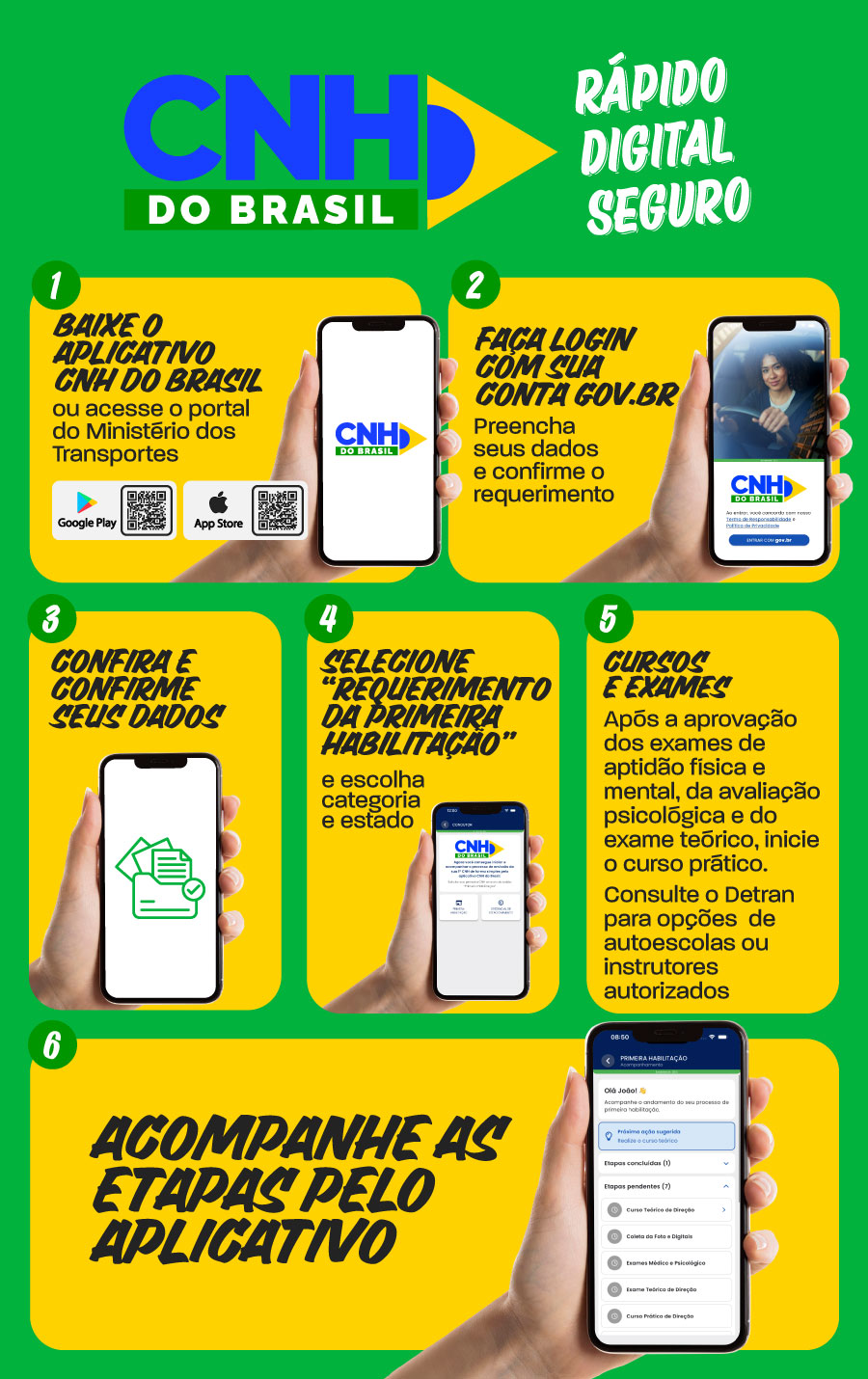Durante todo o processo, o aplicativo permite acompanhar, em tempo real, cada etapa para obter a CNH: curso teórico; coleta biométrica; exames médico e psicológico; exame teórico; curso prático; exame prático; e emissão da Permissão para Dirigir (PPD).