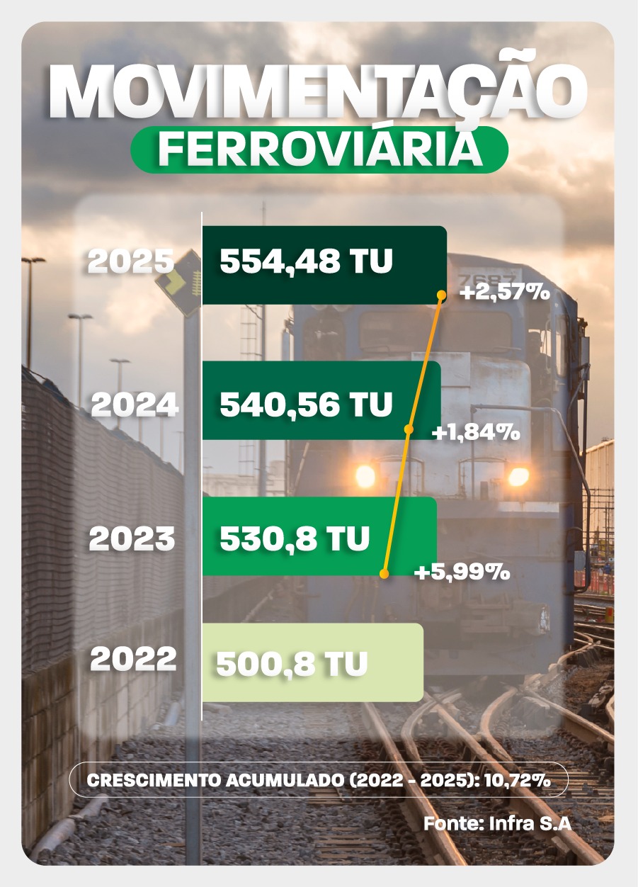 O Ministério dos Transportes registrou, no fim de 2025, um novo marco na área ferroviária. A movimentação alcançou 555,48 milhões de toneladas úteis (TU), o que representa alta de 2,57% na comparação com 2024, das cargas escoadas pelos trilhos do país para abastecimento interno e comércio exterior. O resultado é parte da atuação do Governo do Brasil para ampliar a malha logística nacional. Para 2026, estão previstos R$140 bilhões em investimentos no setor com a realização de oito leilões até o fim do ano, com projeção de R$600 bilhões injetados no modal.