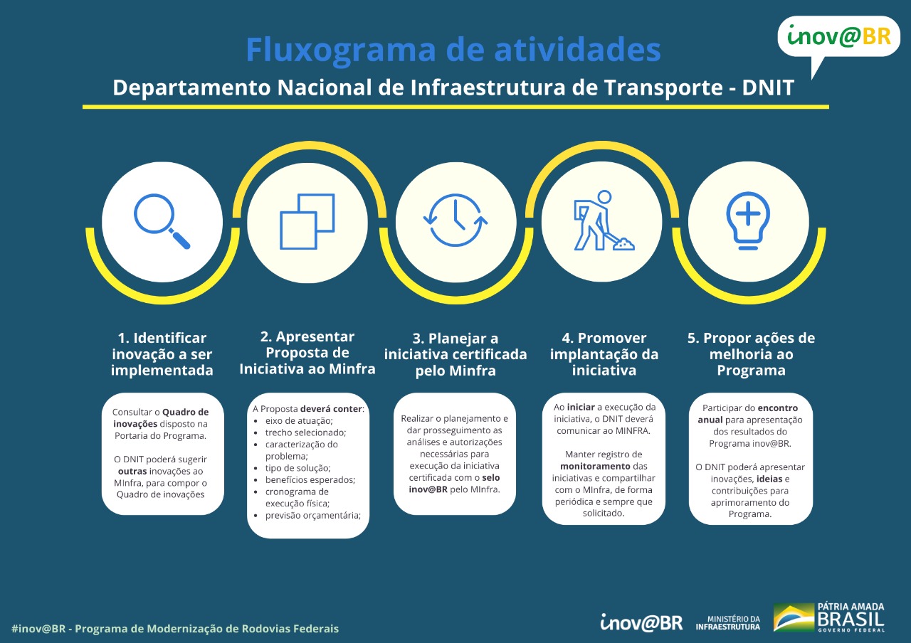 O Modelo de Gestão definido para o Programa foi baseado em um ciclo PDCA (Planejar, Executar, Monitorar e Avaliar), que contempla as etapas de identificação e estruturação da iniciativa; implantação das ações ou intervenções; monitoramento e controle; encerramento das iniciativas; e aprimoramento contínuo do programa como um todo, conforme figuras abaixo, as quais abrangem a representação do ciclo inov@BR, suas etapas e atividades: