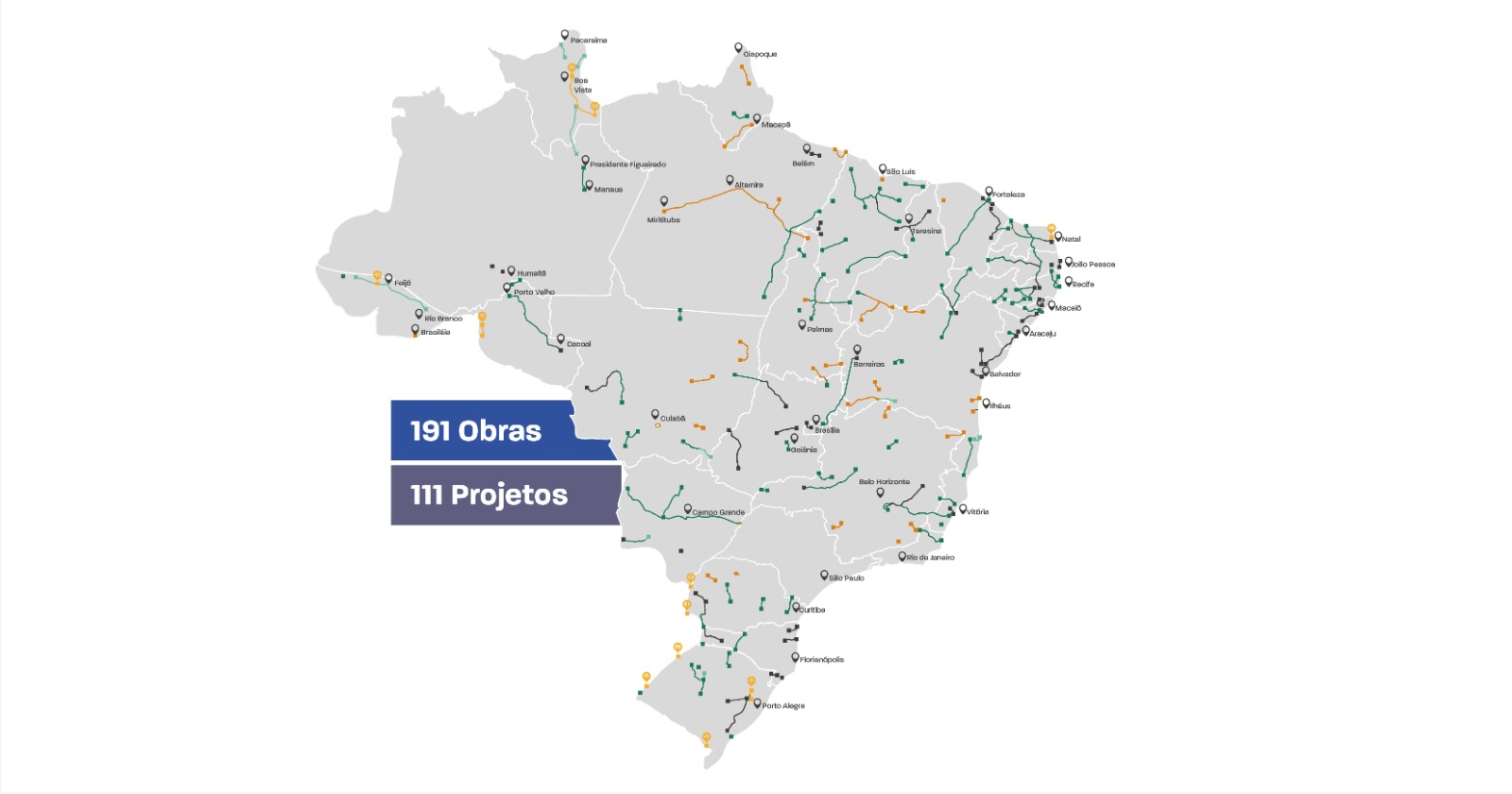 Nessa conjuntura, o Governo Federal, por meio do Ministério dos Transportes, apresenta a atual pipeline dos empreendimentos, no qual o estado brasileiro avança na redução da burocracia e no aprimoramento das regulamentações a fim de acelerar o crescimento econômico e a inclusão social, gerando emprego e renda, reduzindo desigualdades sociais e regionais através do programa de investimentos, o Novo PAC.