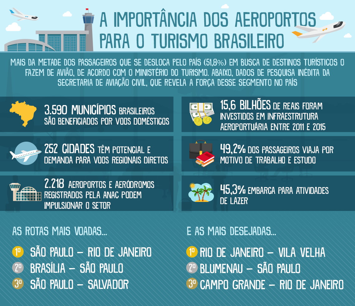 O estudo da SAC também mostra que 49,2% do total de passageiros viaja por motivo de trabalho e estudo e 45,3% embarca para atividades de lazer. Significa dizer que quase metade dos viajantes de avião o fazem pelo turismo. As rotas mais requisitadas atualmente são: 1ª - São Paulo–Rio de Janeiro, 2ª - Brasília–São Paulo e 3ª - São Paulo–Salvador, segundo a pesquisa.