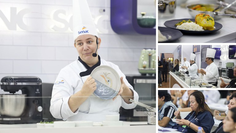 COZINHA SHOW - O Ministério do Turismo trouxe para dentro do Salão do Turismo o espaço Cozinha Show, que celebra a riqueza e a diversidade da gastronomia brasileira. Chefs especializados do SENAC preparam ao vivo receitas típicas de diferentes estados, transformando o ambiente em uma verdadeira viagem de sabores pelo país. A iniciativa valoriza a cultura culinária nacional, promove a identidade regional e reforça o papel da gastronomia como um dos grandes atrativos do turismo no Brasil.