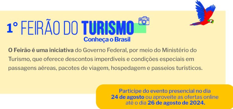 O Ministério do Turismo fechou parceria com as principais companhias aéreas do país para participar do Feirão do Turismo, dentro da estratégia "Conheça o Brasil Voando”. Serão ofertas e vantagens especiais, com descontos que podem chegar até 30%, para o viajante aproveitar, fazer as malas e curtir o próximo destino.