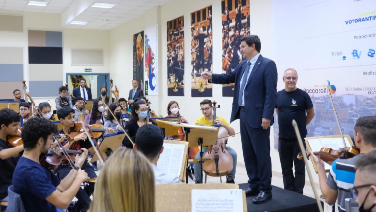 MUSICALIZAÇÃO - Ainda em São Paulo, Carlos Brito visitou o Instituto Baccarelli, em Cidade de Nova Heliópolis. Fundada em 1996, a organização oferece cursos de musicalização, canto e instrumentos a crianças e jovens da comunidade. O instituto também conta com apoio financeiro do Ministério do Turismo, por meio da Lei Rouanet. Apenas entre 2020 e 2022, foram autorizados R$ 24,3 milhões para projetos desenvolvidos pela organização.